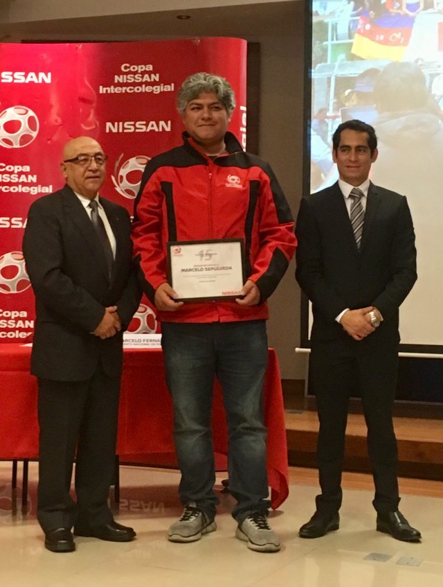 Aktuell nun lud Nissan alle Schulen und Institutionen ein, die dieses Projekt von Anfang an unterstützt haben. So erhielt unsere Schule für die 15-jährige Zusammenarbeit eine Auszeichnung vom National Aftermarket Manager, Herrn Marcelo Fernández, die dem Direktor der Schule, Herrn Stender-Mengel, übergeben wurde.