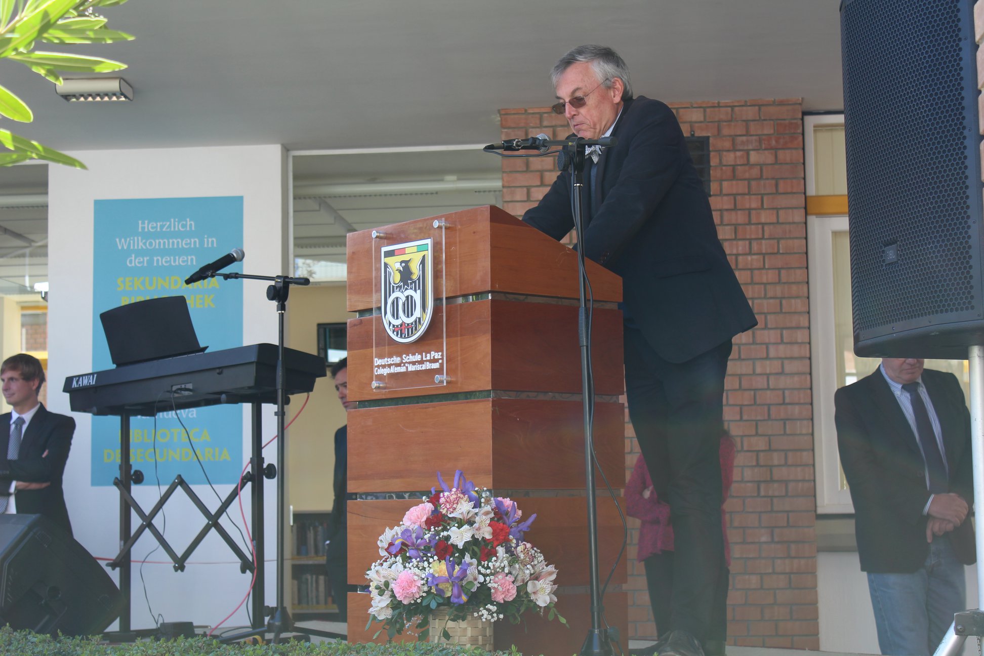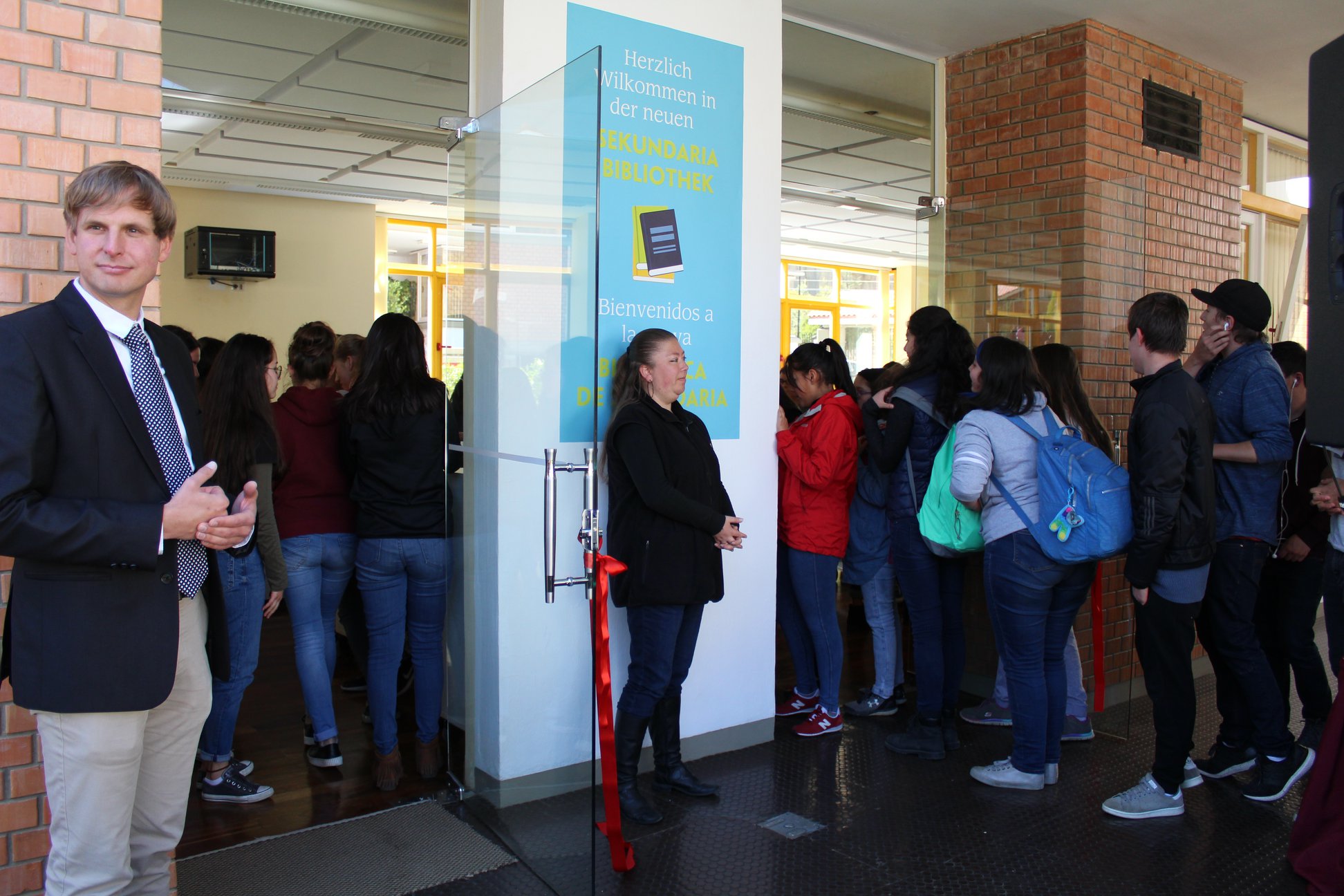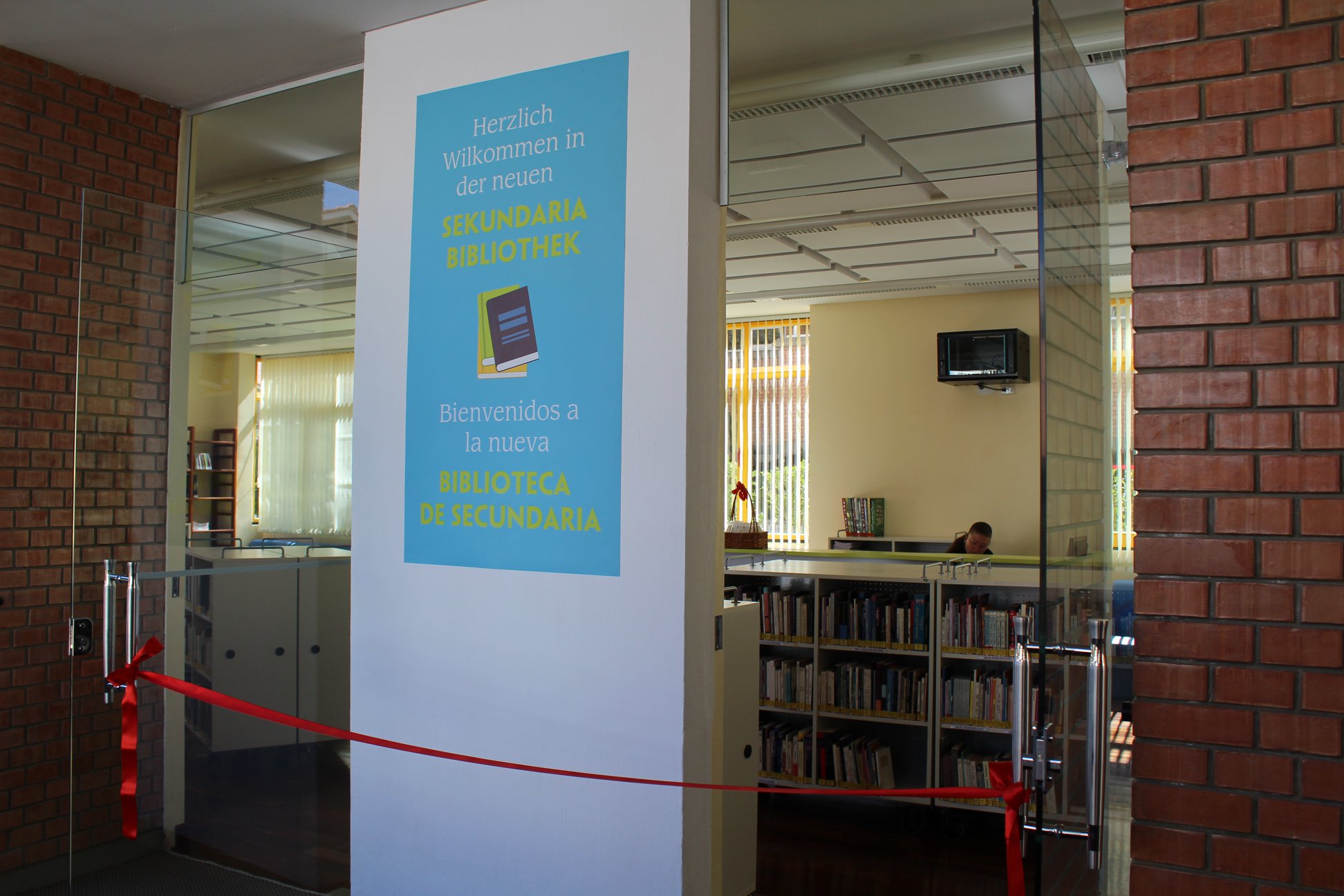 In Anwesenheit vieler Schülerinnen und Schüler der Sekundaria fand heute Morgen die Einweihung unserer neuen Sekundariabibliothek statt. Dazu sprachen Herr Michael Heuchel, Vorsitzender des Deutschen Schulvereins, Herr Adrian Seufert, Ständiger Vertreter der Deutschen Botschaft in Bolivien, unser Schulleiter, Herr Volker Stender-Mengel, und Frau Ana María Grisi, stellvertretende Schulleiterin unserer Schule.