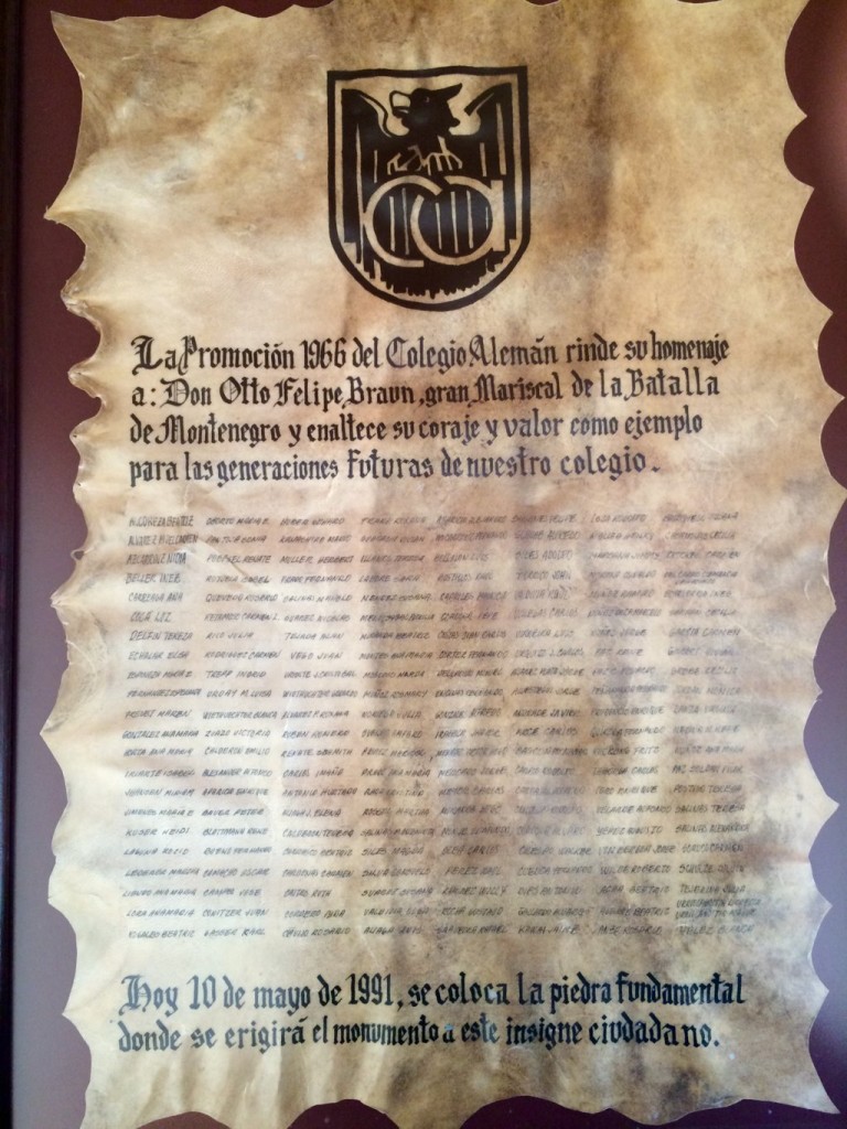Vor der Schule, dort wo heute das Denkmal des Mariscal Braun steht, legten sie damals eine Urkunde ihres Jahrgangs in das Fundament des späteren Denkmals, mit dem Versprechen auch, genau dort ein Denkmal von Otto Philipp Braun errichten zu wollen, was wenige Zeit danach geschah.