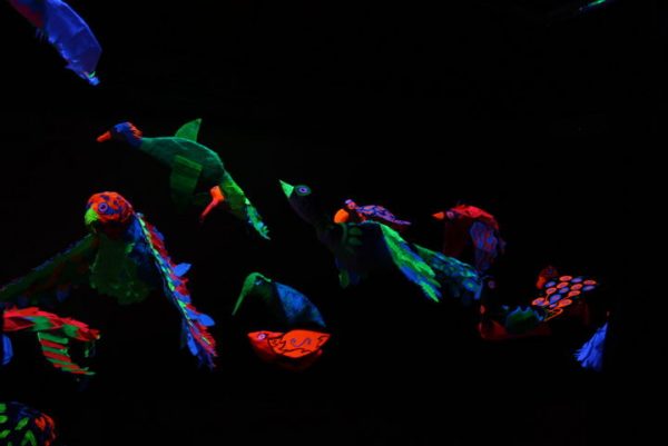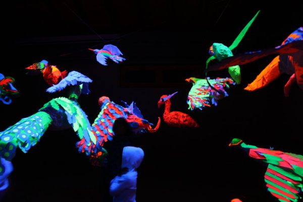 La atracción especial: los enormes y brillantes pájaros que, gracias a la luz negra, parecían volar de color neón durante la noche. Simplemente fantástico.