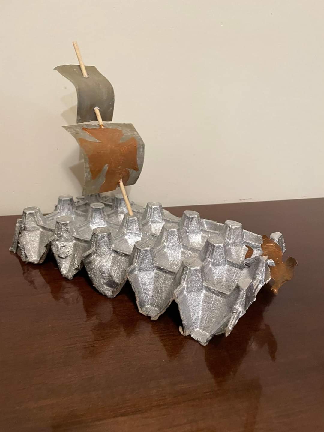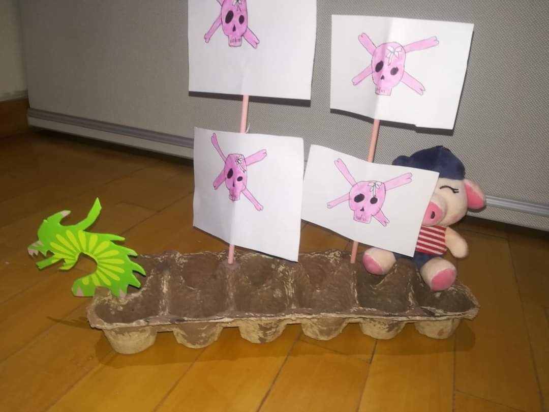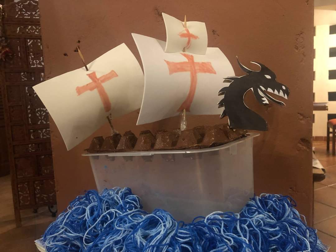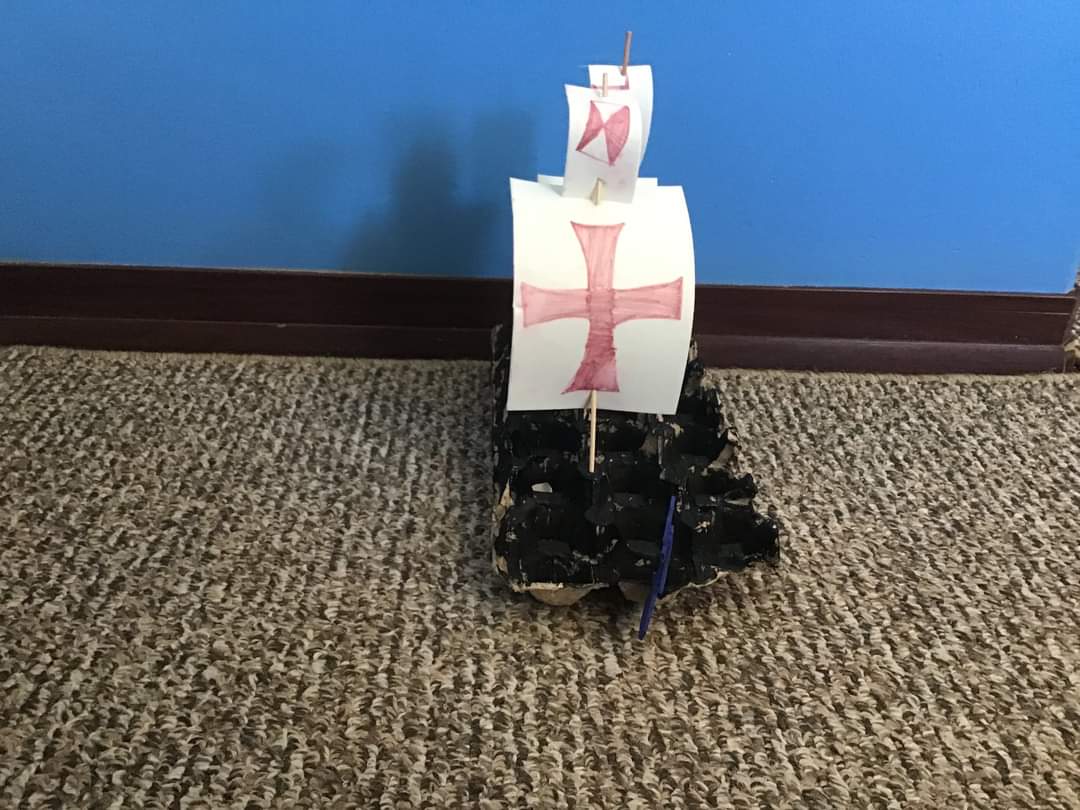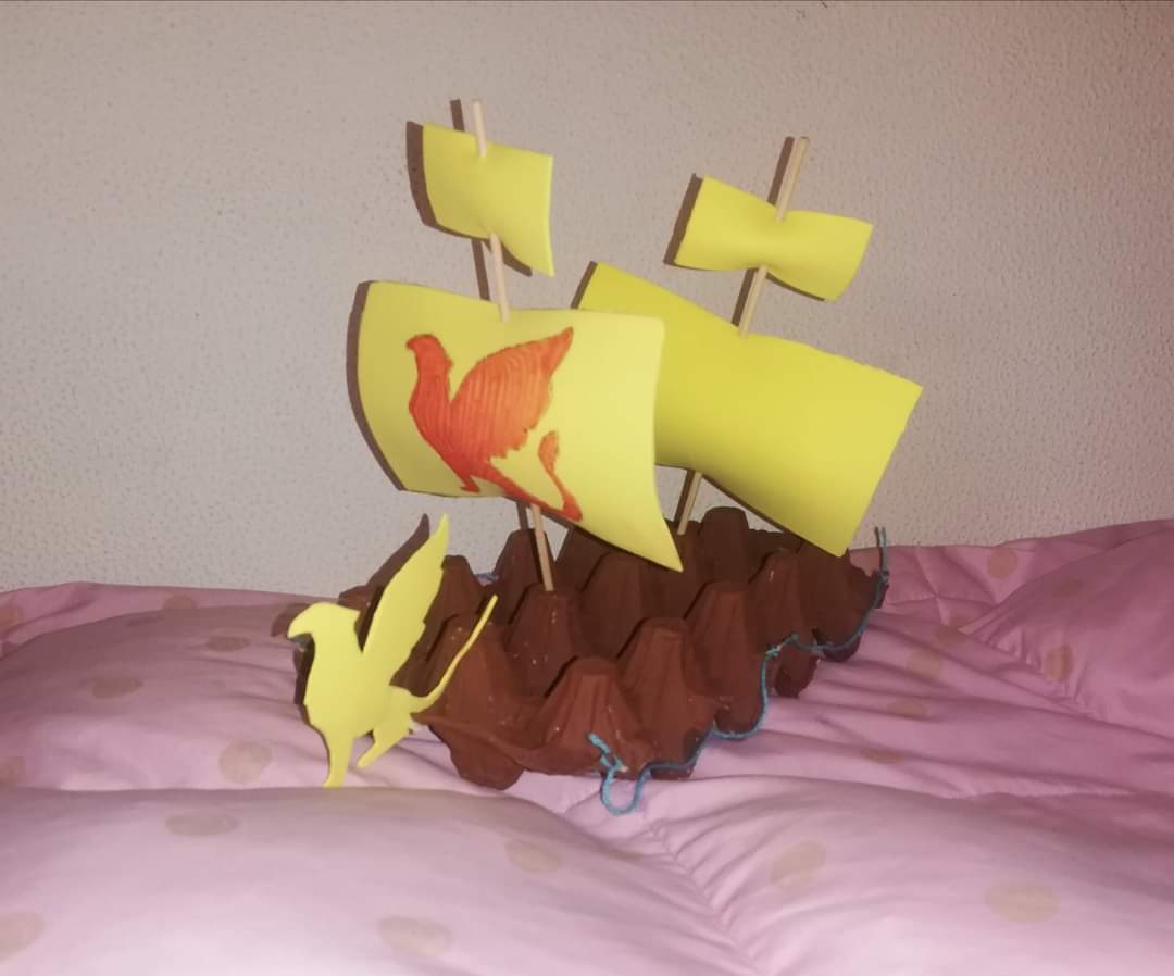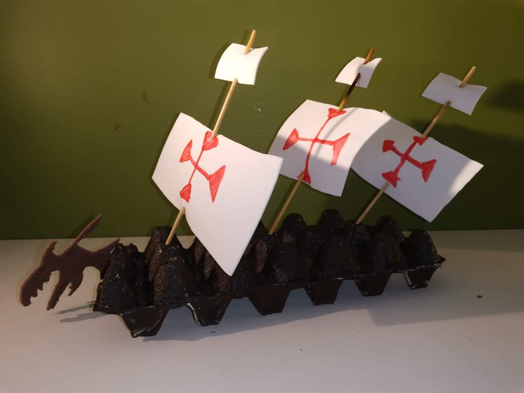 Finalmente, Colón obtiene el dinero de los reyes de España para iniciar su aventura. Durante la lectura, los estudiantes de P4 representaron pequeños diálogos de la obra y también hicieron sus carabelas. Les mostramos algunas de ellas.